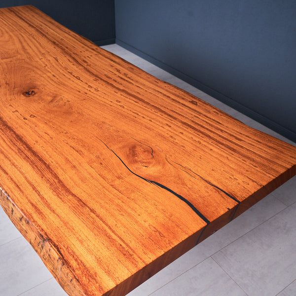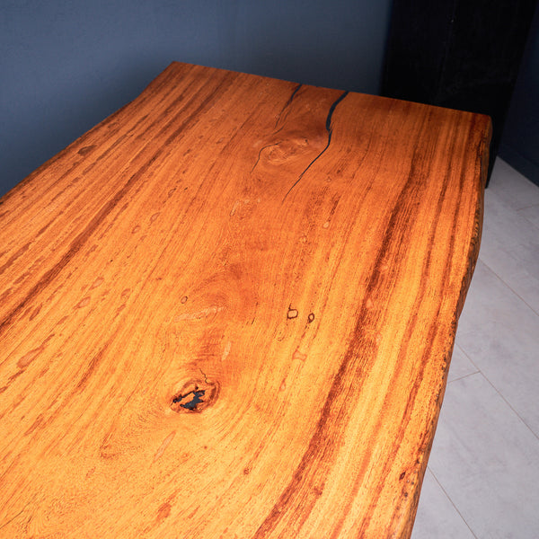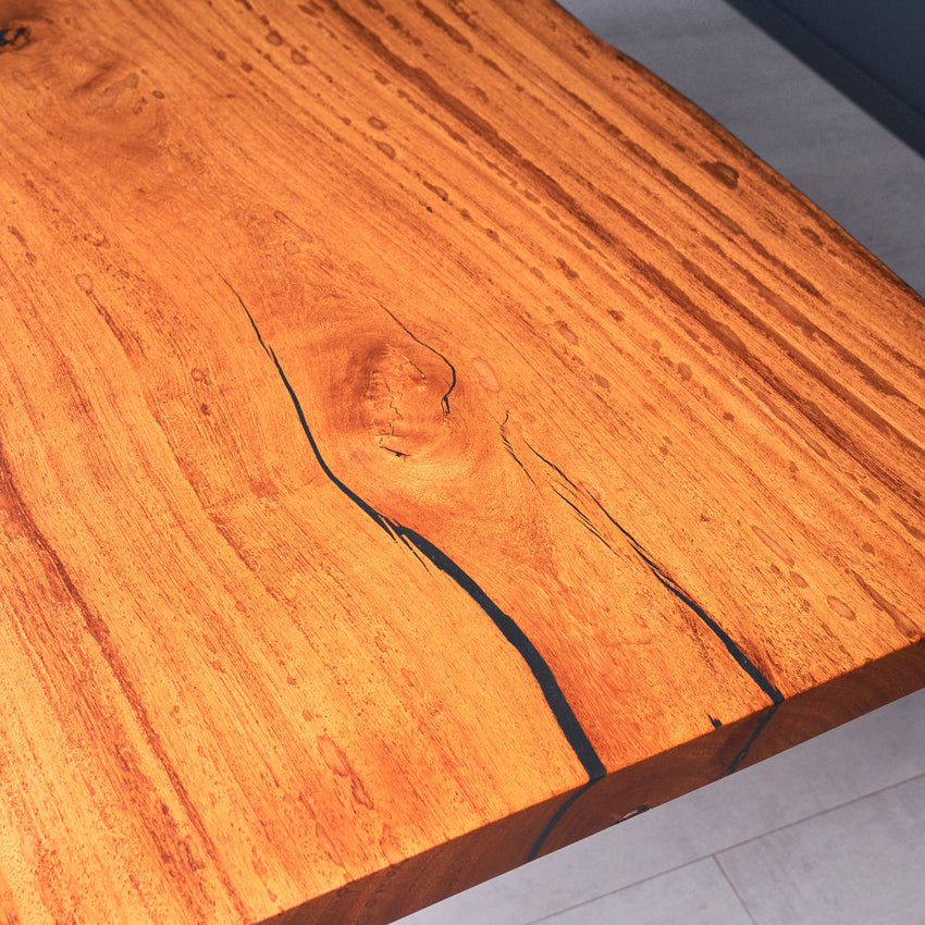 Der Tisch besteht aus einem Stück massivem Basralocus-Holz und ist 7cm stark. Dadurch ist das Holz sehr langlebig und belastbar. Natürlich wollen wir nur das Beste für unsere Kunden liefern, weshalb das Holz bis zu 10 / 12% rückgetrocknet wird. Die Unterseite ist mit Stahlprofilen bewährt, um sicherzustellen, dass sich das Holz kaum verzieht.