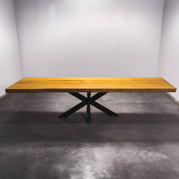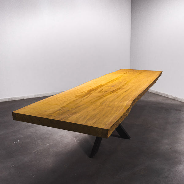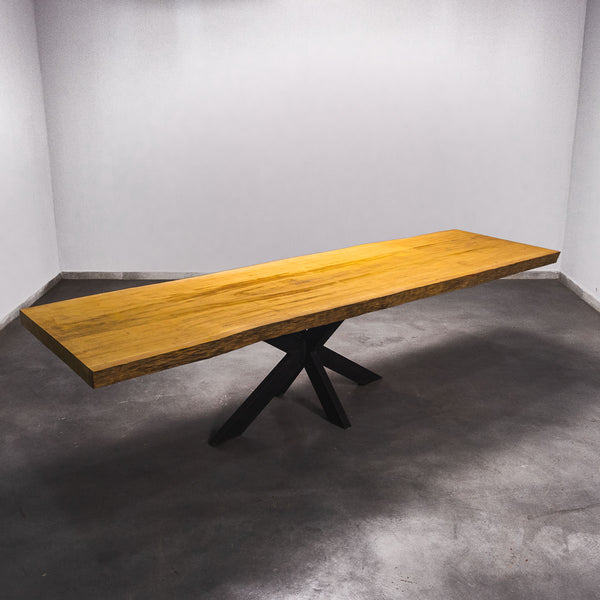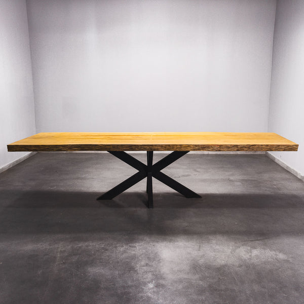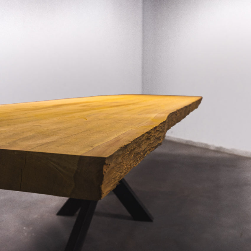 Der Tisch besteht aus einem Stück massivem Bilinga-Holz und ist 7cm stark. Dadurch ist das Holz sehr langlebig und belastbar. Natürlich wollen wir nur das Beste für unsere Kunden liefern, weshalb das Holz bis zu 10 / 12% rückgetrocknet wird. Die Unterseite ist mit Stahlprofilen bewährt, um sicherzustellen, dass sich das Holz kaum verzieht.