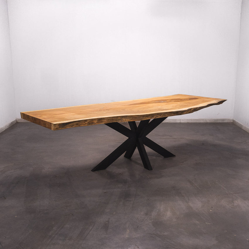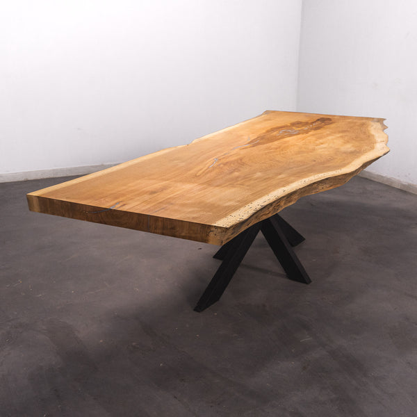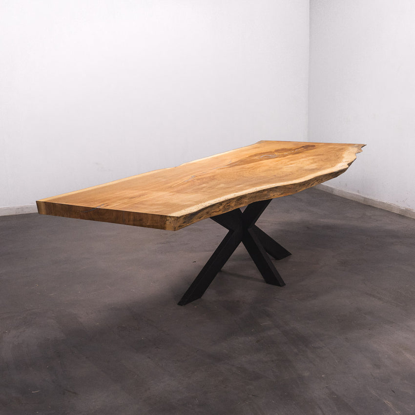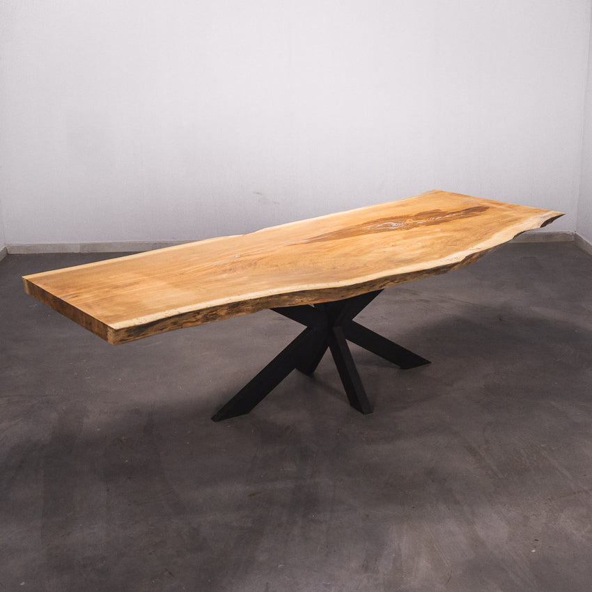 Der Tisch besteht aus einem Stück massivem Doussie-Holz und ist 7cm stark. Dadurch ist das Holz sehr langlebig und belastbar. Natürlich wollen wir nur das Beste für unsere Kunden liefern, weshalb das Holz bis zu 10 / 12% rückgetrocknet wird. Die Unterseite ist mit Stahlprofilen bewährt, um sicherzustellen, dass sich das Holz kaum verzieht.