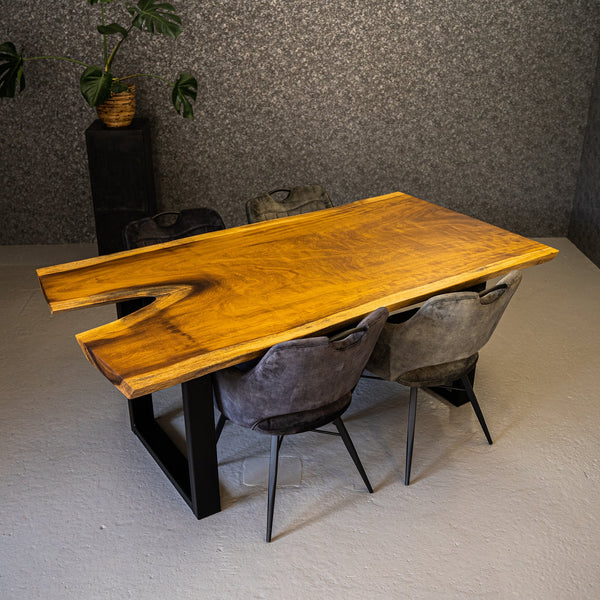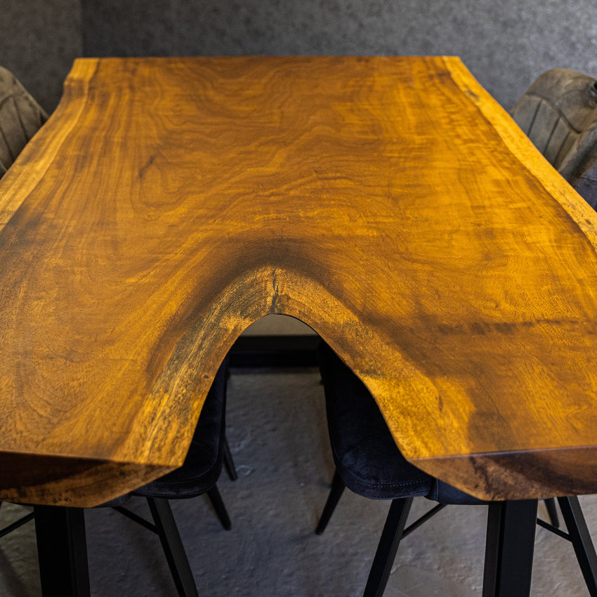 Diese einzigartige Holzart namens Iroko ist ein Hartholz. Iroko hat eine Melange aus verschiedenen Farben, ausgehend von einer wunderschönen goldgelben Farbe bis hin zu tiefem dunkelbraun. Die Außenseite der Tischplatte hat eine schöne helle Färbung. Iroko ist bekannt für seine Festigkeit und Haltbarkeit. Es ist eine Tischplatte, die sehr wenig Pflege benötigt und daher ideal ist, wenn Sie keine Zeit haben, um sich regelmäßig darum zu kümmern.