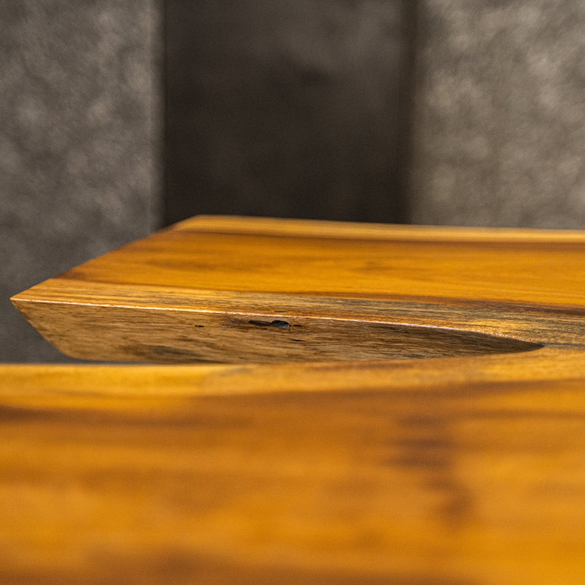 Der Tisch besteht aus einem Stück massivem Iroko-Holz und ist 6,5cm stark. Dadurch ist das Holz sehr langlebig und belastbar. Natürlich wollen wir nur das Beste für unsere Kunden liefern, weshalb das Holz bis zu 10 / 12% rückgetrocknet wird. Die Unterseite ist mit Stahlprofilen bewährt, um sicherzustellen, dass sich das Holz kaum verzieht.