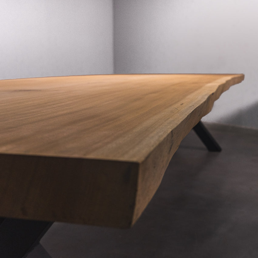 Der Tisch besteht aus einem Stück massivem Sapelli-Holz und ist 7cm stark. Dadurch ist das Holz sehr langlebig und belastbar. Natürlich wollen wir nur das Beste für unsere Kunden liefern, weshalb das Holz bis zu 10 / 12% rückgetrocknet wird. Die Unterseite ist mit Stahlprofilen bewährt, um sicherzustellen, dass sich das Holz kaum verzieht.