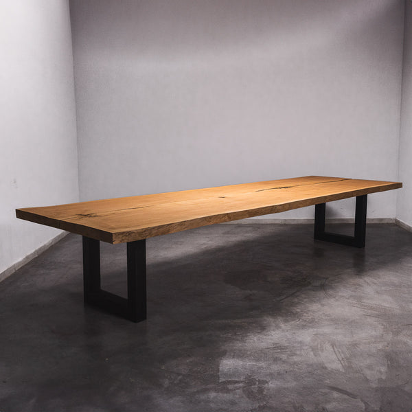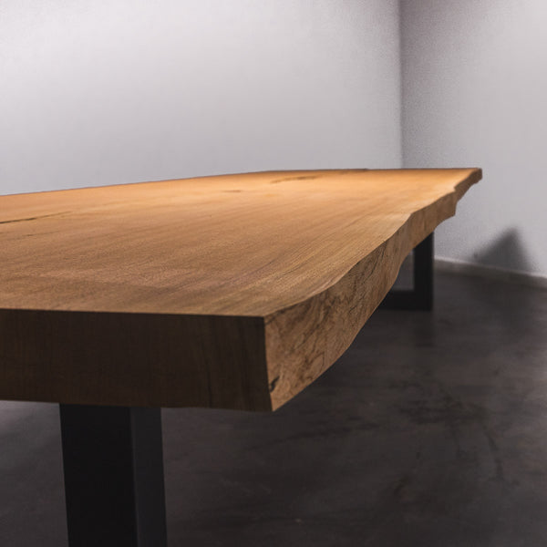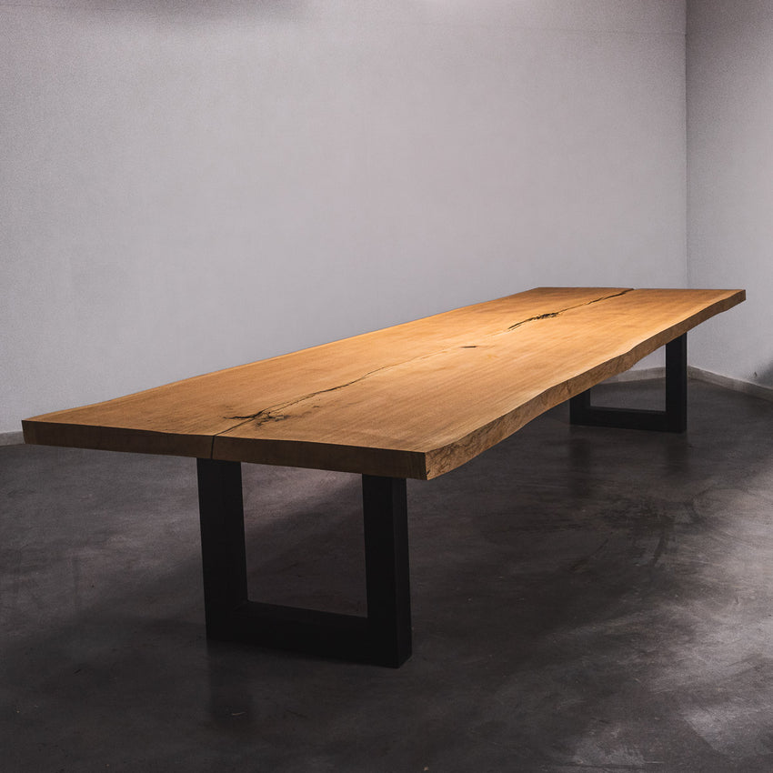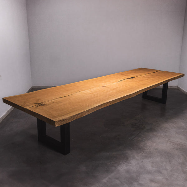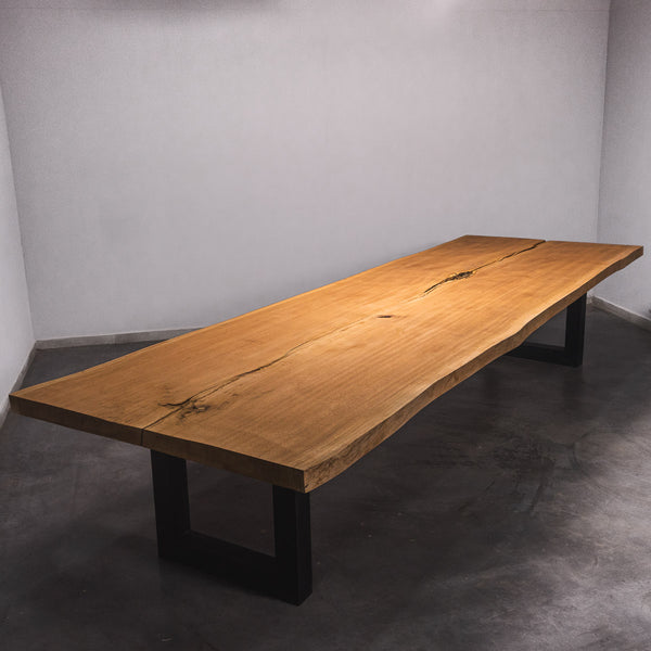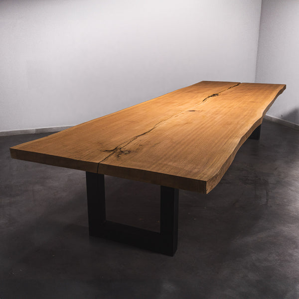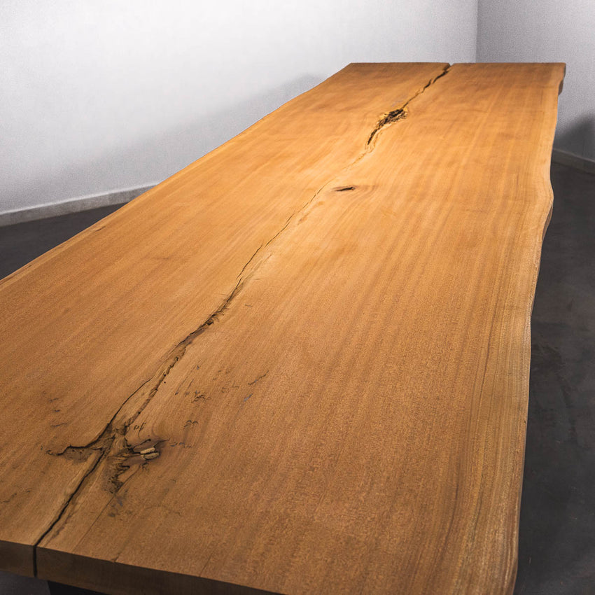 Der Tisch besteht aus einem Stück massivem Sipo-Holz und ist 7cm stark. Dadurch ist das Holz sehr langlebig und belastbar. Natürlich wollen wir nur das Beste für unsere Kunden liefern, weshalb das Holz bis zu 10 / 12% rückgetrocknet wird. Die Unterseite ist mit Stahlprofilen bewährt, um sicherzustellen, dass sich das Holz kaum verzieht.
