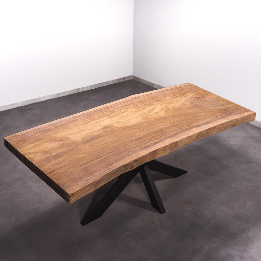 Der Tisch besteht aus einem Stück massivem Tali-Holz und ist 7cm stark. Dadurch ist das Holz sehr langlebig und belastbar. Natürlich wollen wir nur das Beste für unsere Kunden liefern, weshalb das Holz bis zu 10 / 12% rückgetrocknet wird. Die Unterseite ist mit Stahlprofilen bewährt, um sicherzustellen, dass sich das Holz kaum verzieht.