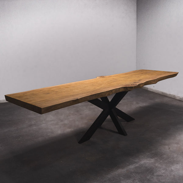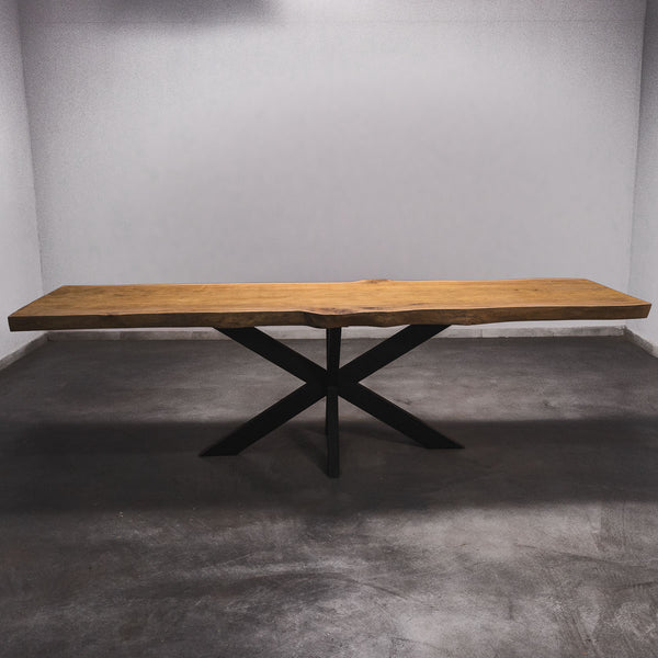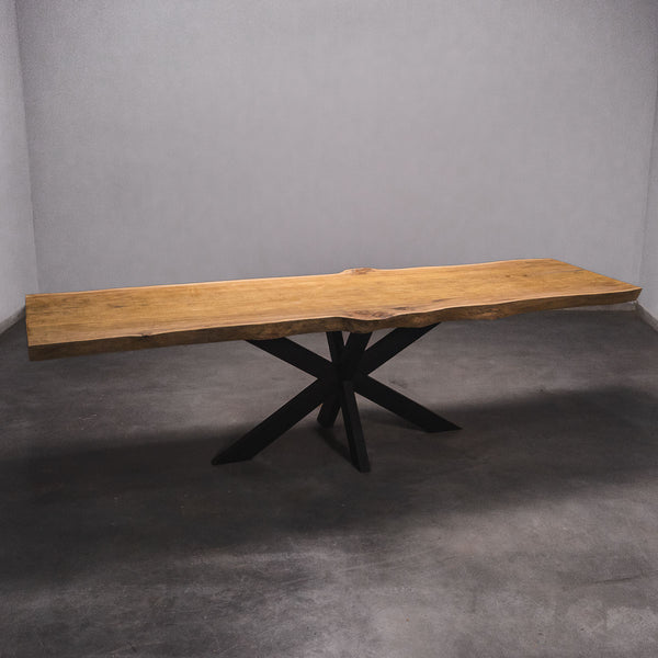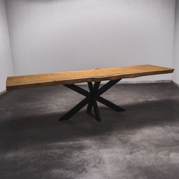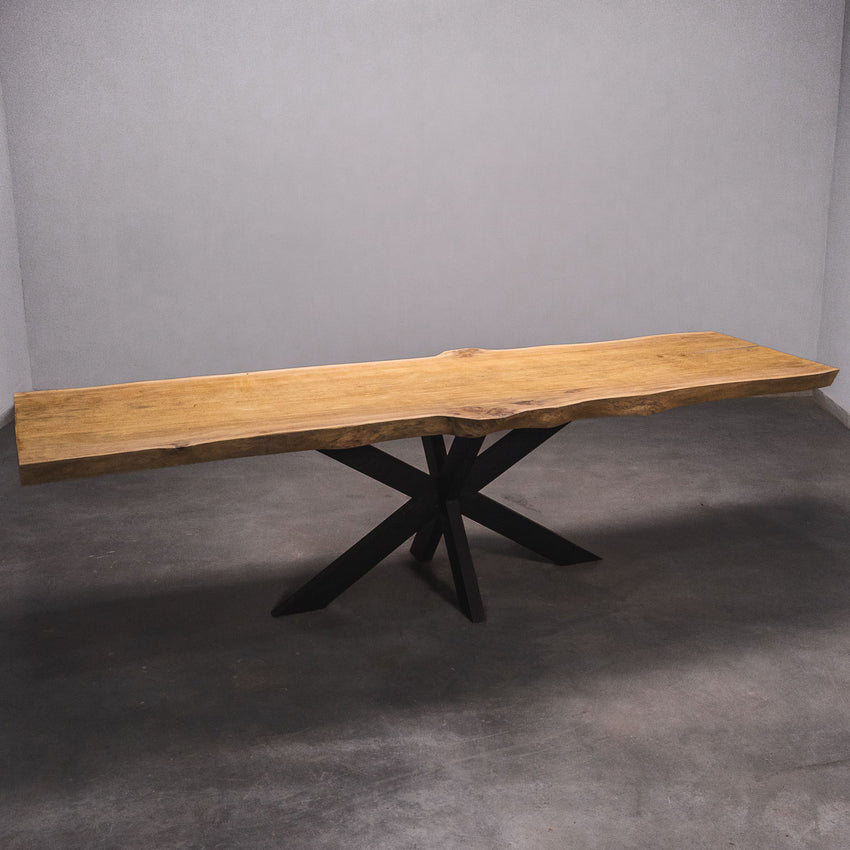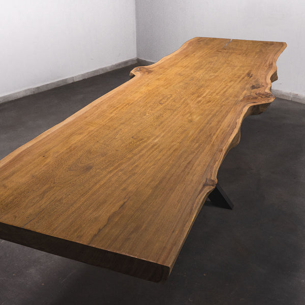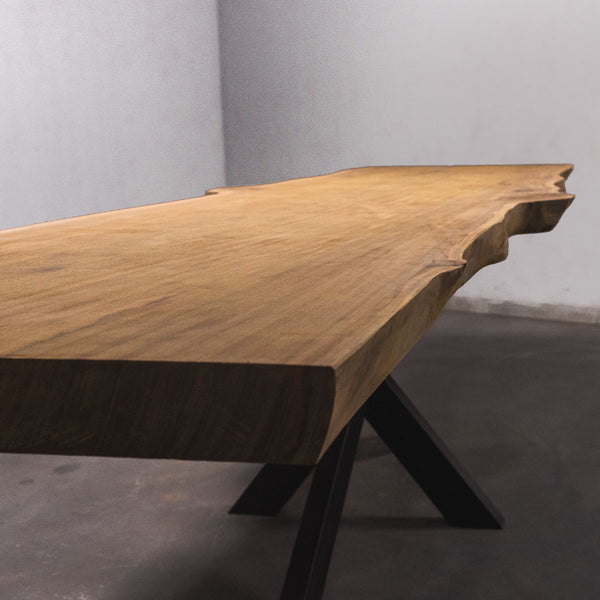 Der Tisch besteht aus einem Stück massivem Tali-Holz und ist 7cm stark. Dadurch ist das Holz sehr langlebig und belastbar. Natürlich wollen wir nur das Beste für unsere Kunden liefern, weshalb das Holz bis zu 10 / 12% rückgetrocknet wird. Die Unterseite ist mit Stahlprofilen bewährt, um sicherzustellen, dass sich das Holz kaum verzieht.