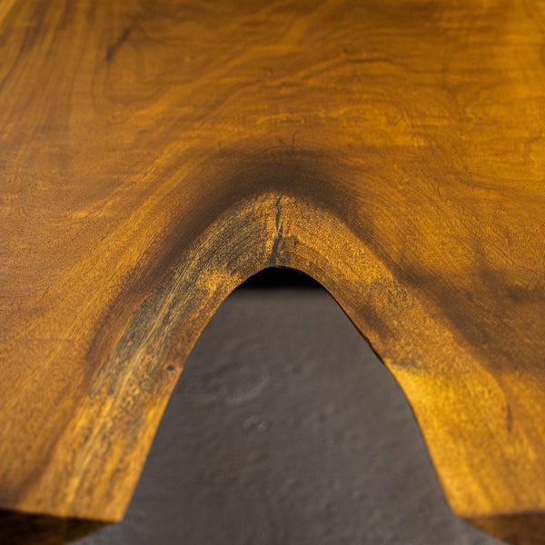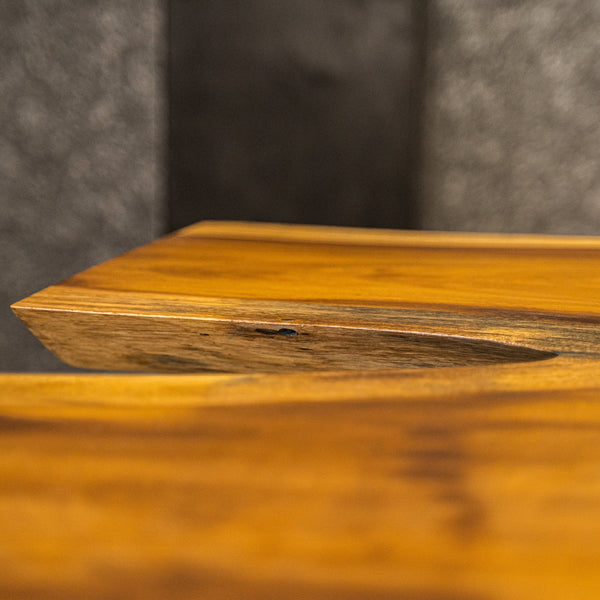 Diese einzigartige Holzart namens Iroko ist ein Hartholz. Iroko hat eine Melange aus verschiedenen Farben, ausgehend von einer wunderschönen goldgelben Farbe bis hin zu tiefem dunkelbraun. Die Außenseite der Tischplatte hat eine schöne helle Färbung. Iroko ist bekannt für seine Festigkeit und Haltbarkeit. Es ist eine Tischplatte, die sehr wenig Pflege benötigt und daher ideal ist, wenn Sie keine Zeit haben, um sich regelmäßig darum zu kümmern.