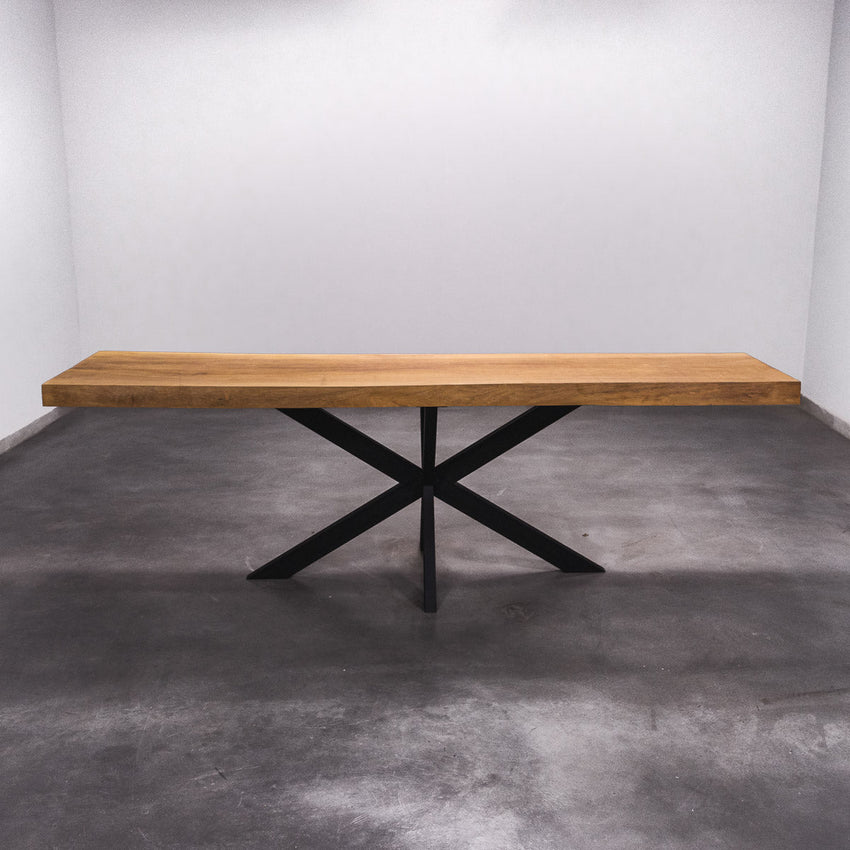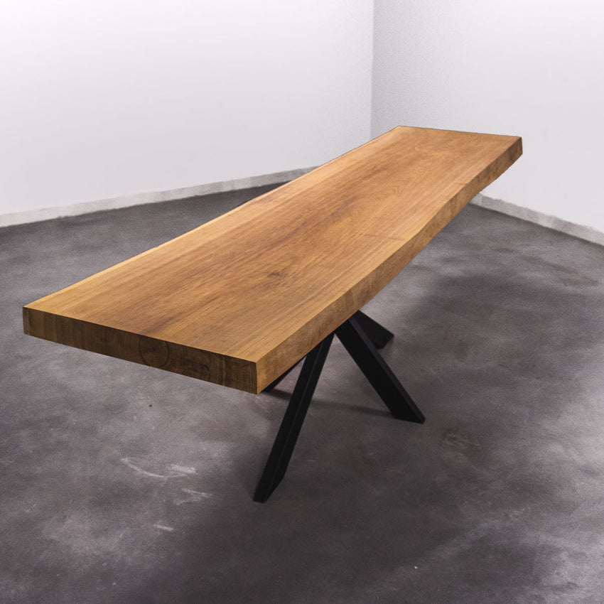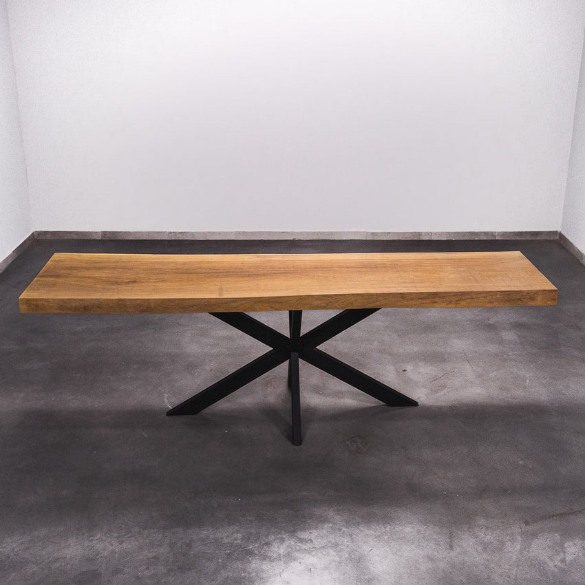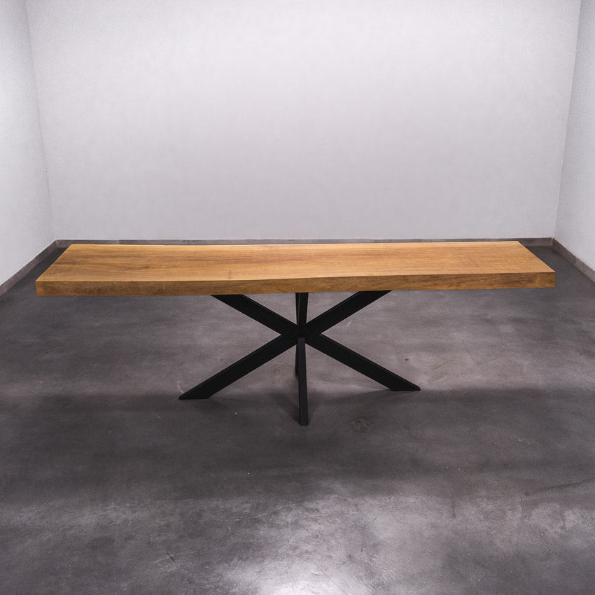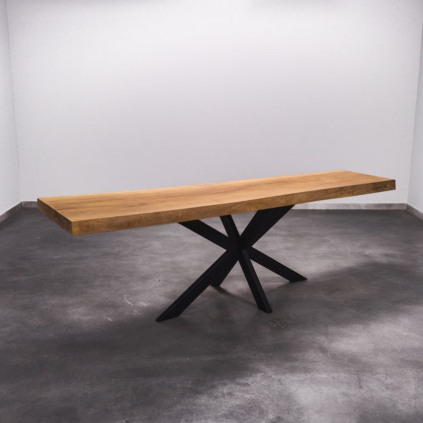 Der Tisch besteht aus einem Stück massivem Iroko-Holz und ist 6,5cm stark. Dadurch ist das Holz sehr langlebig und belastbar. Natürlich wollen wir nur das Beste für unsere Kunden liefern, weshalb das Holz bis zu 10 / 12% rückgetrocknet wird. Die Unterseite ist mit Stahlprofilen bewährt, um sicherzustellen, dass sich das Holz kaum verzieht.