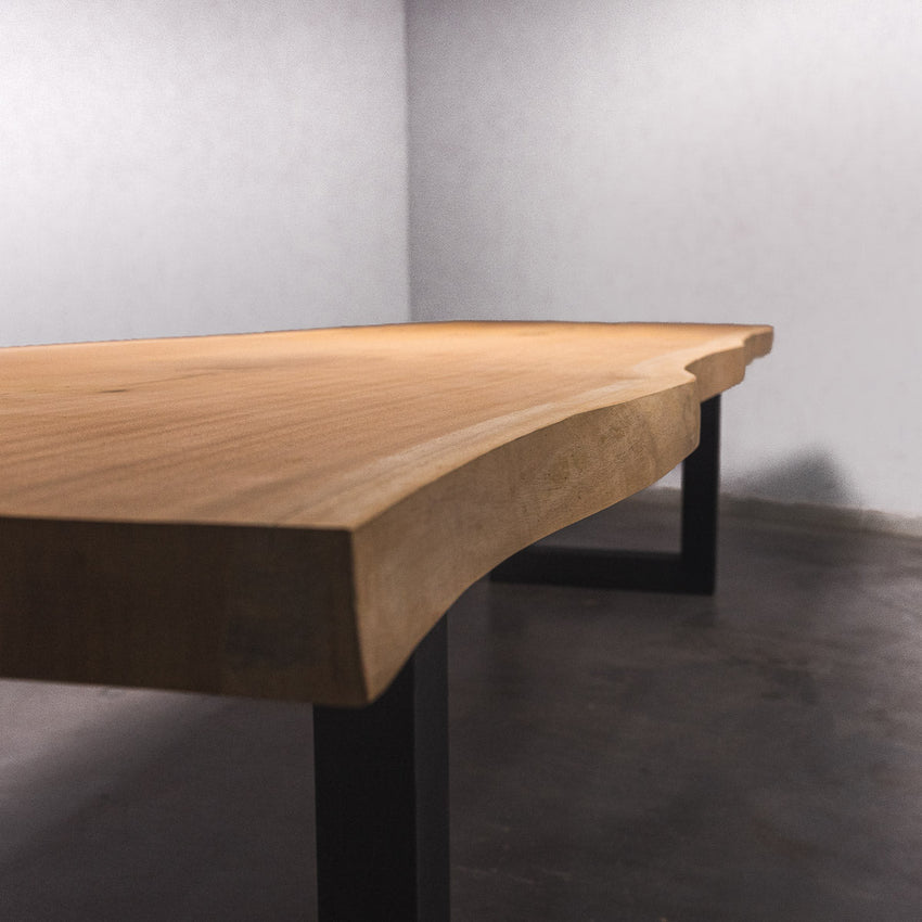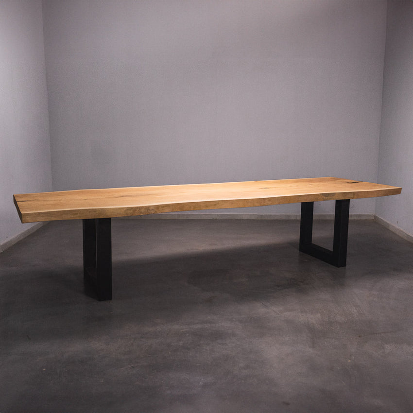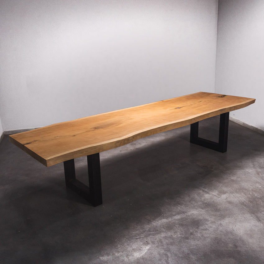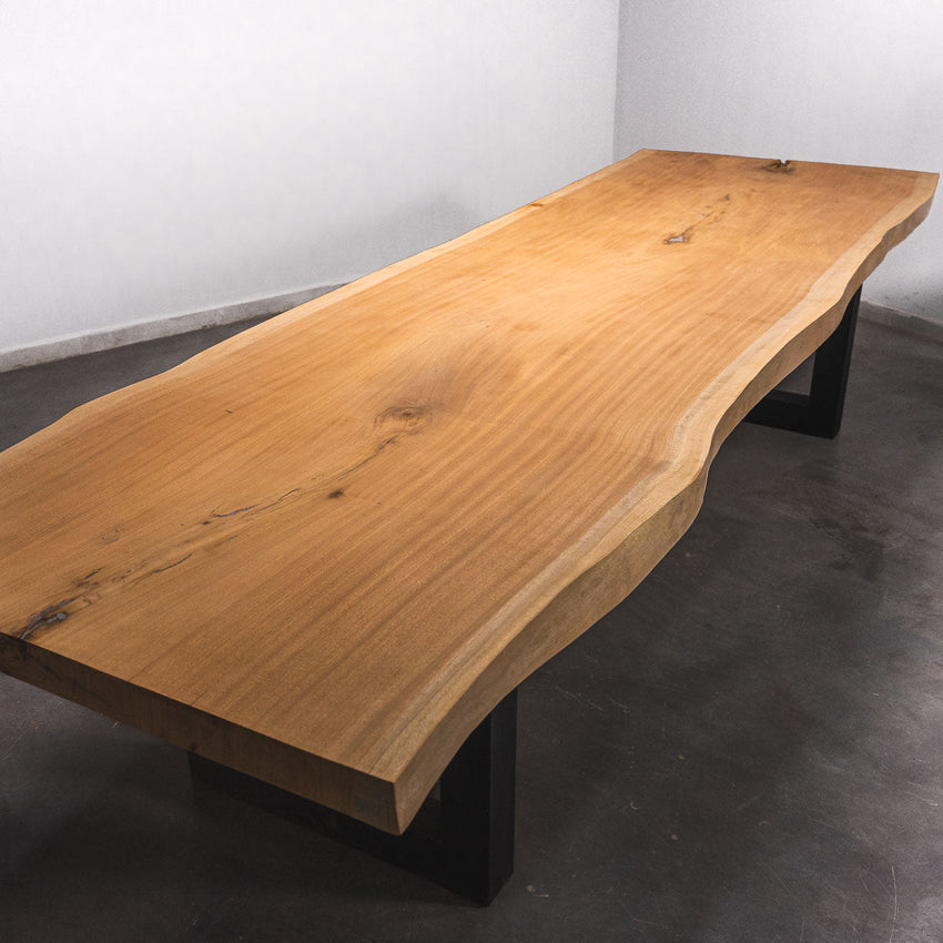 Der Tisch besteht aus einem Stück massivem Sapelli-Holz und ist 7cm stark. Dadurch ist das Holz sehr langlebig und belastbar. Natürlich wollen wir nur das Beste für unsere Kunden liefern, weshalb das Holz bis zu 10 / 12% rückgetrocknet wird. Die Unterseite ist mit Stahlprofilen bewährt, um sicherzustellen, dass sich das Holz kaum verzieht.