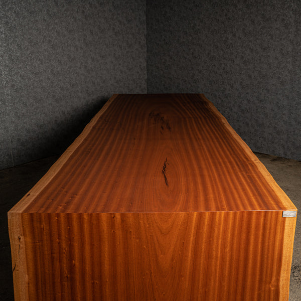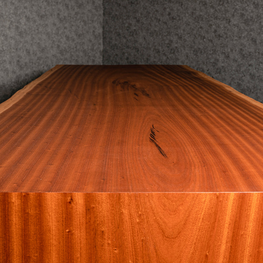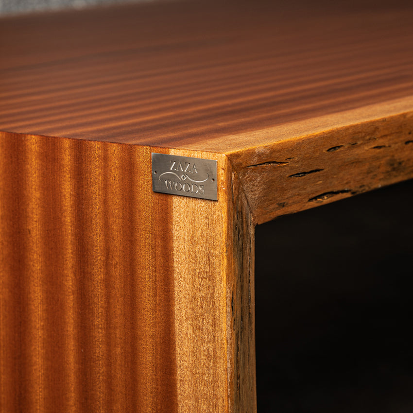 Sapelli ist ein wunderschönes Hartholz mit einer prächtigen, gleichmäßigen Färbung. Die Tischplatte besteht aus einem Stück massivem Sapelli-Holz, dass der Form des Baumes folgt. Das Holz hat eine spezielle rosa-rote Farbe, die mit der Zeit nachdunkelt in ein tiefes rötlich-braun. Die Außenseite hat einen erkennbar hellen Farbton. Wenn das Sonnenlicht darauf scheint, entsteht ein strahlender, goldener Glanz auf der Tischplatte. Sapelli hat eine charakteristische regelmäßige Streifenzeichnung des Wuchses und sieht daher straff und edel aus. Das Holz ist sehr langlebig und verschleißfest und wird jahrelang halten.