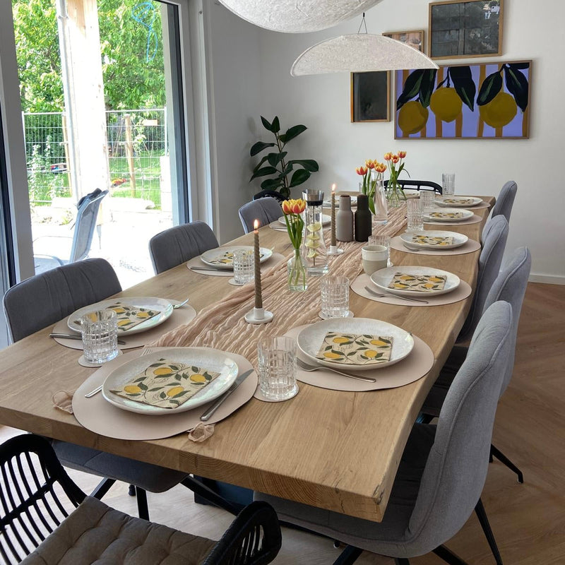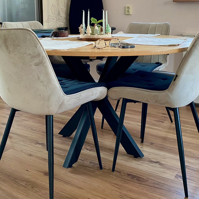 Der Esstisch besteht zu 100% aus massivem Eichenholz und ist 4 cm stark. Dadurch ist der Tisch extrem haltbar und sehr langlebig.