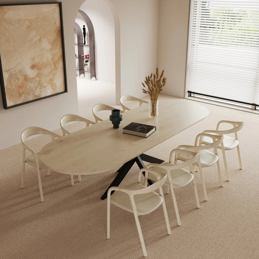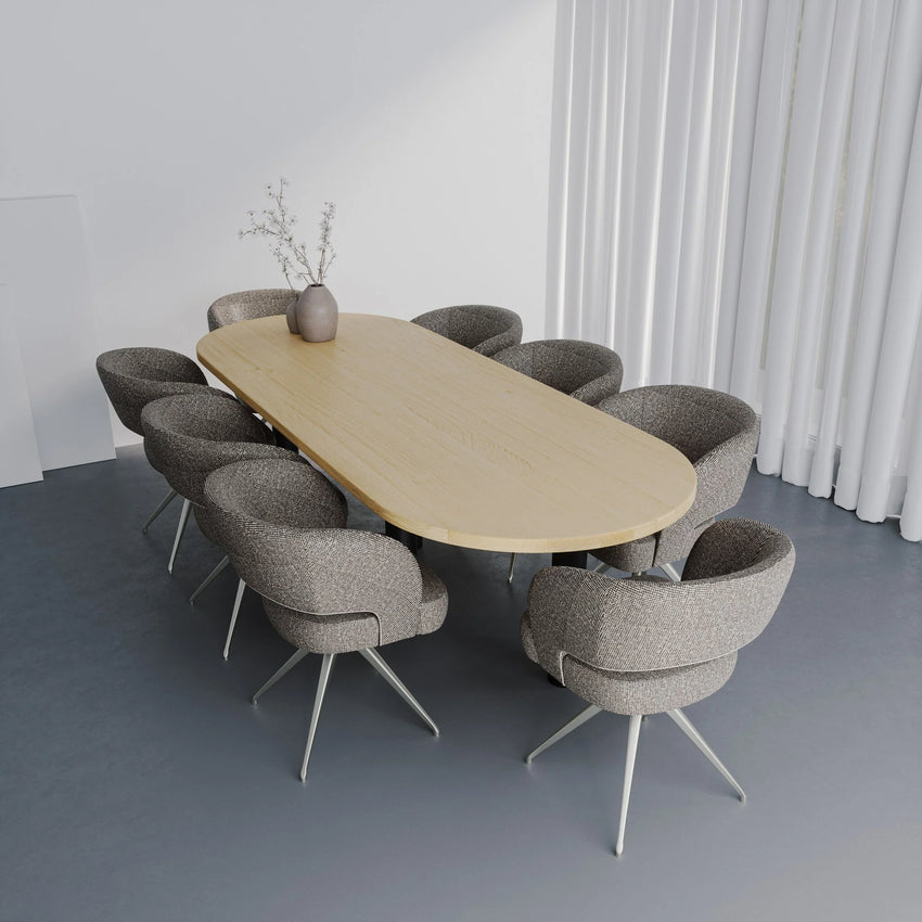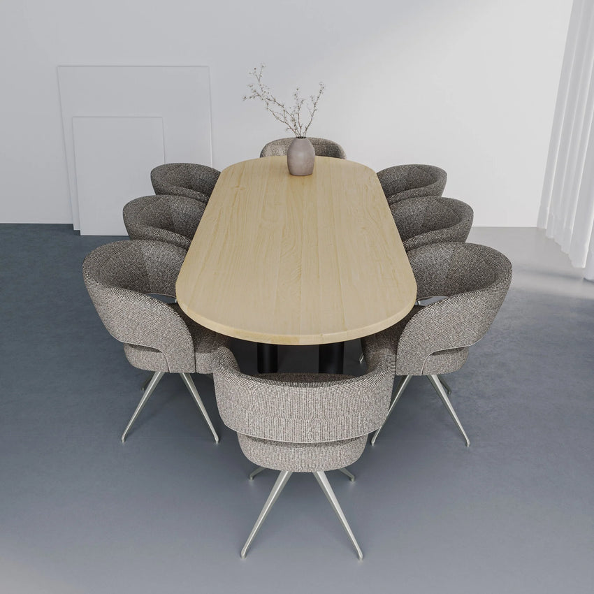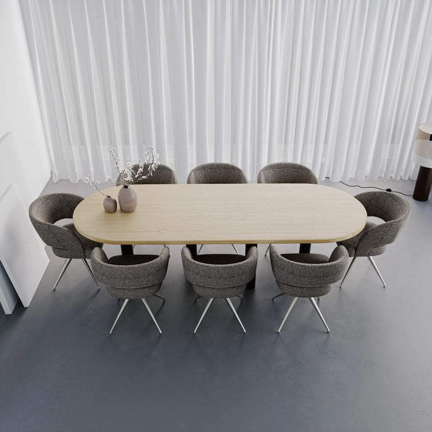 Die Kieselform macht diesen Tisch zu einem echten Blickfang. Inspiriert von der Natur wirkt das Design lockerer und luftiger als traditionelle Formen. Die asymmetrischen Rundungen erzeugen einen überraschenden räumlichen Effekt und verleihen jedem Sitzplatz eine einzigartige Dynamik.