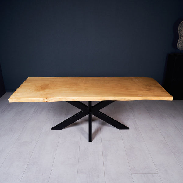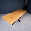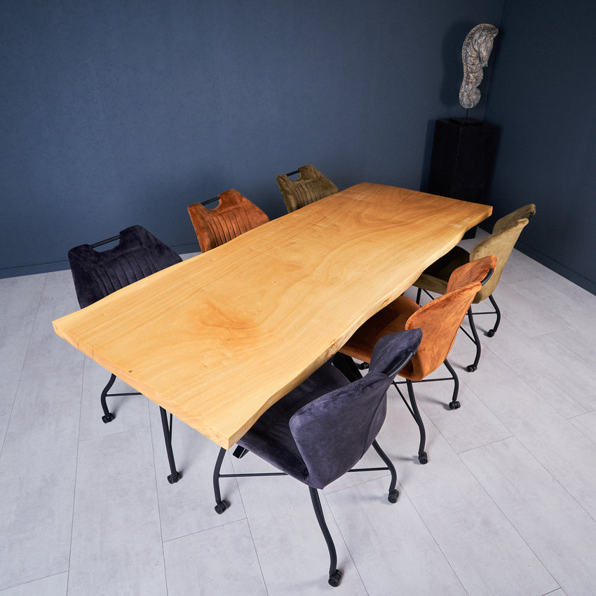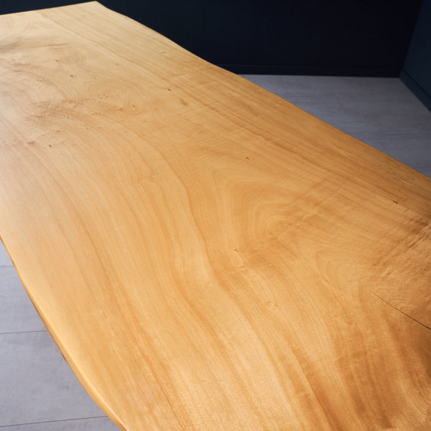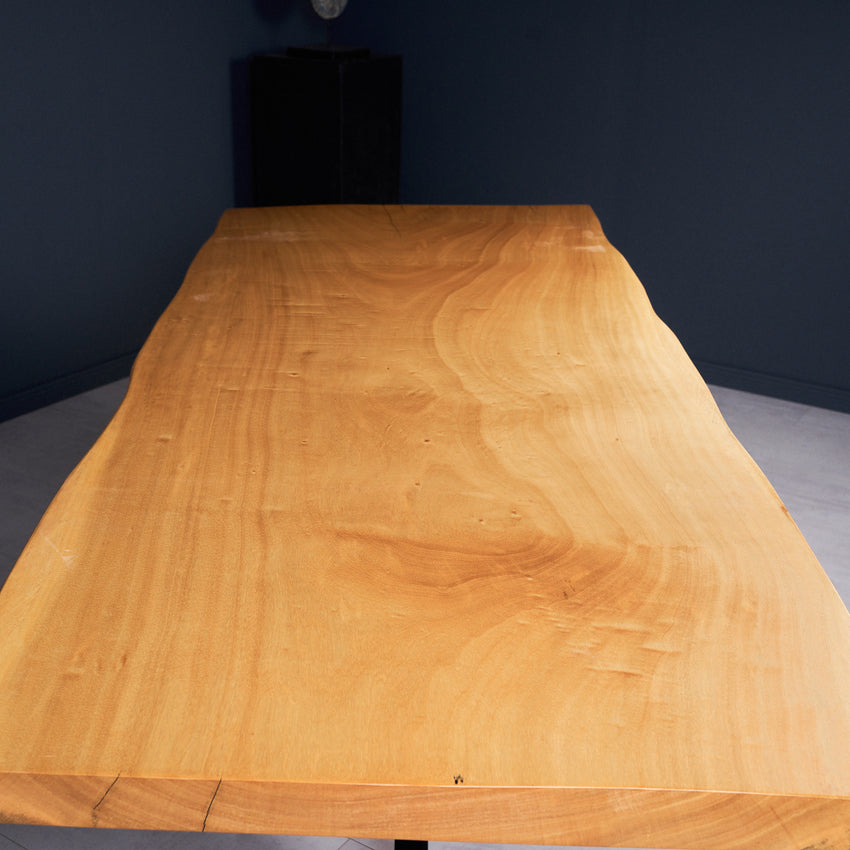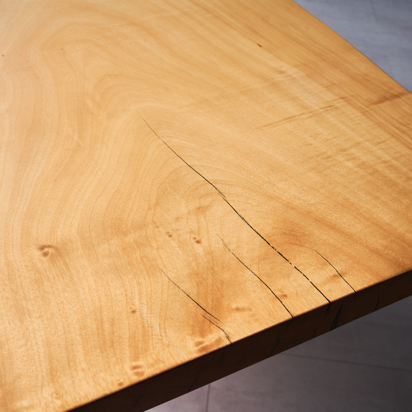 Avodire-Holz reagiert schneller auf Luftfeuchtigkeit und "arbeitet" mehr wie unsere anderen Holzarten, wodurch die Tischplatte leicht gewellt und nicht vollkommen gerade ist. Die Stärke des Tisches variiert leicht über die gesamte Länge.